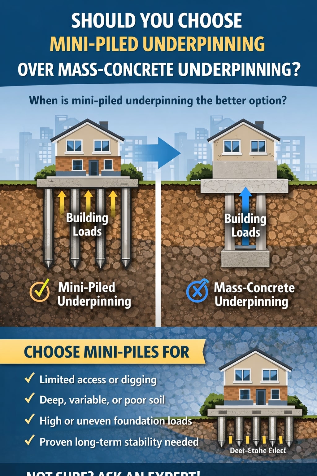 Should you choose mini-piled underpinning over mass-concrete underpinning?