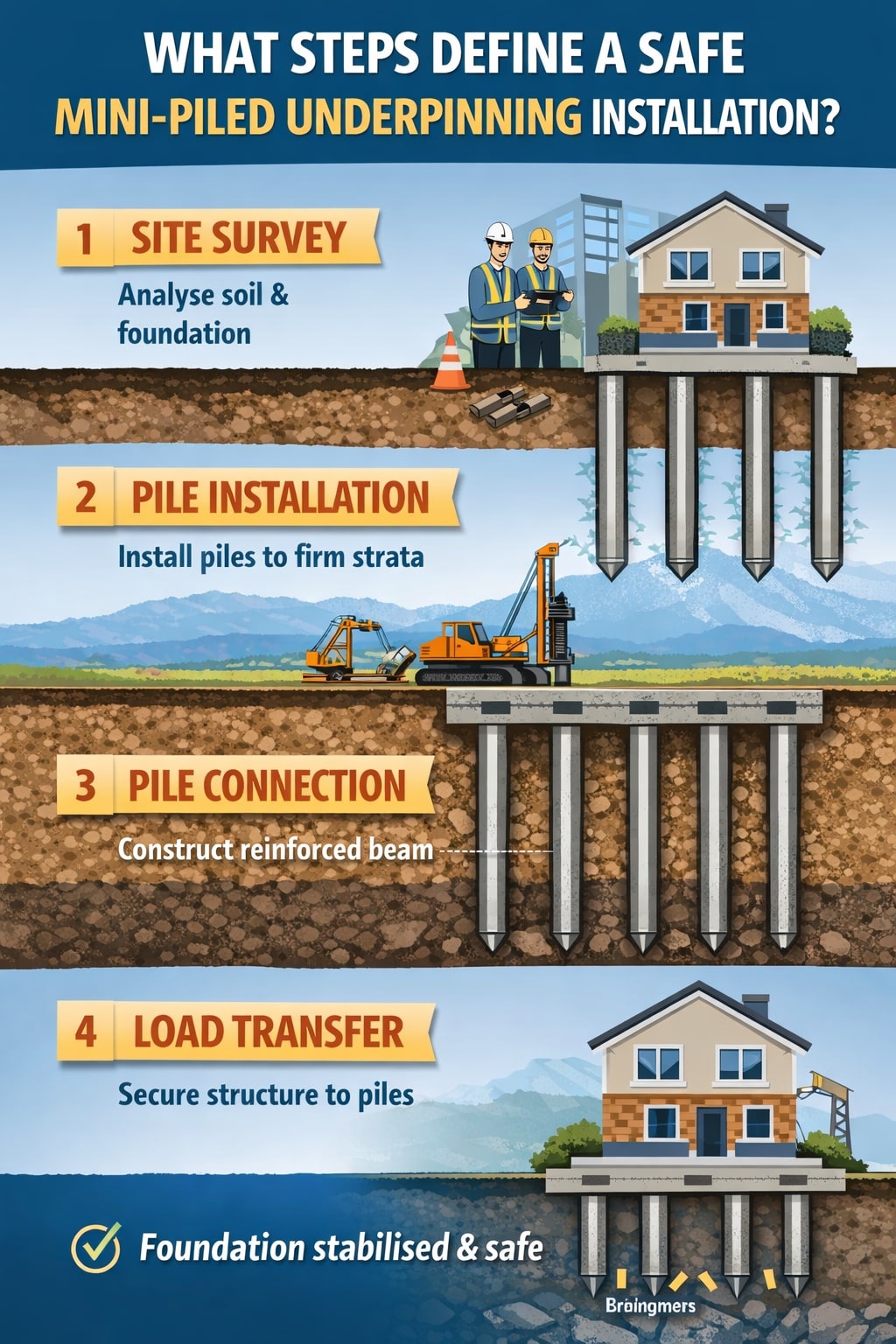 Safe mini-piled underpinning relies on structured planning, controlled installation, and continuous verification to ensure the foundation remains stable. The process starts with comprehensive documentation that maps the existing structure, foundation layout, underpinning phases, and the depth of nearby buildings. Installation follows with drilling small-diameter piles beneath the foundation, then filling them with concrete to create new load-bearing supports in confined or restricted-access areas. Ongoing monitoring verifies that the foundation stops moving and achieves long-term stability.