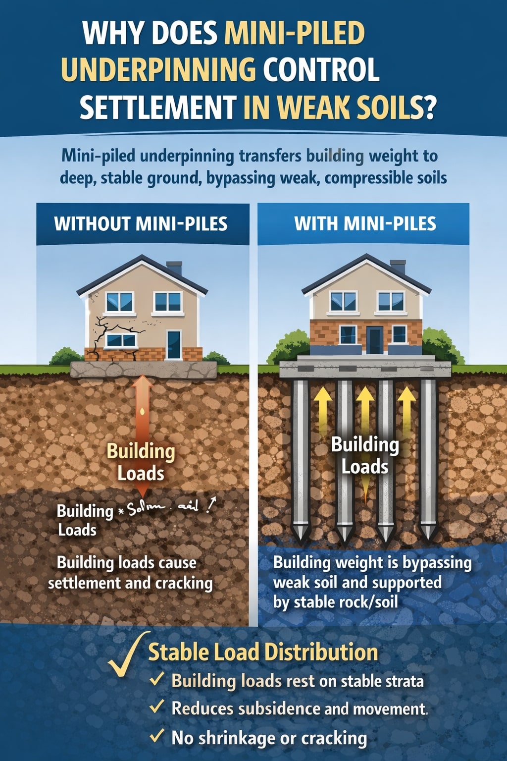 Mini-piled underpinning controls settlement in weak soils because it is a modern technique designed to transfer the structural load from unstable, shallow layers to deeper, more competent soil strata or bedrock. This stabilization is achieved by installing small-diameter piles—such as steel helical or push piers—which are driven to great depths and attached to the foundation, providing discrete support points. Unlike traditional underpinning that creates new continuous concrete footings, mini-piling effectively bypasses the weak soil below the existing footing, preventing further sinking and potentially lifting the structure. This method is particularly useful when ground conditions vary, access is restricted, or when minimal excavation and structural movement are required.